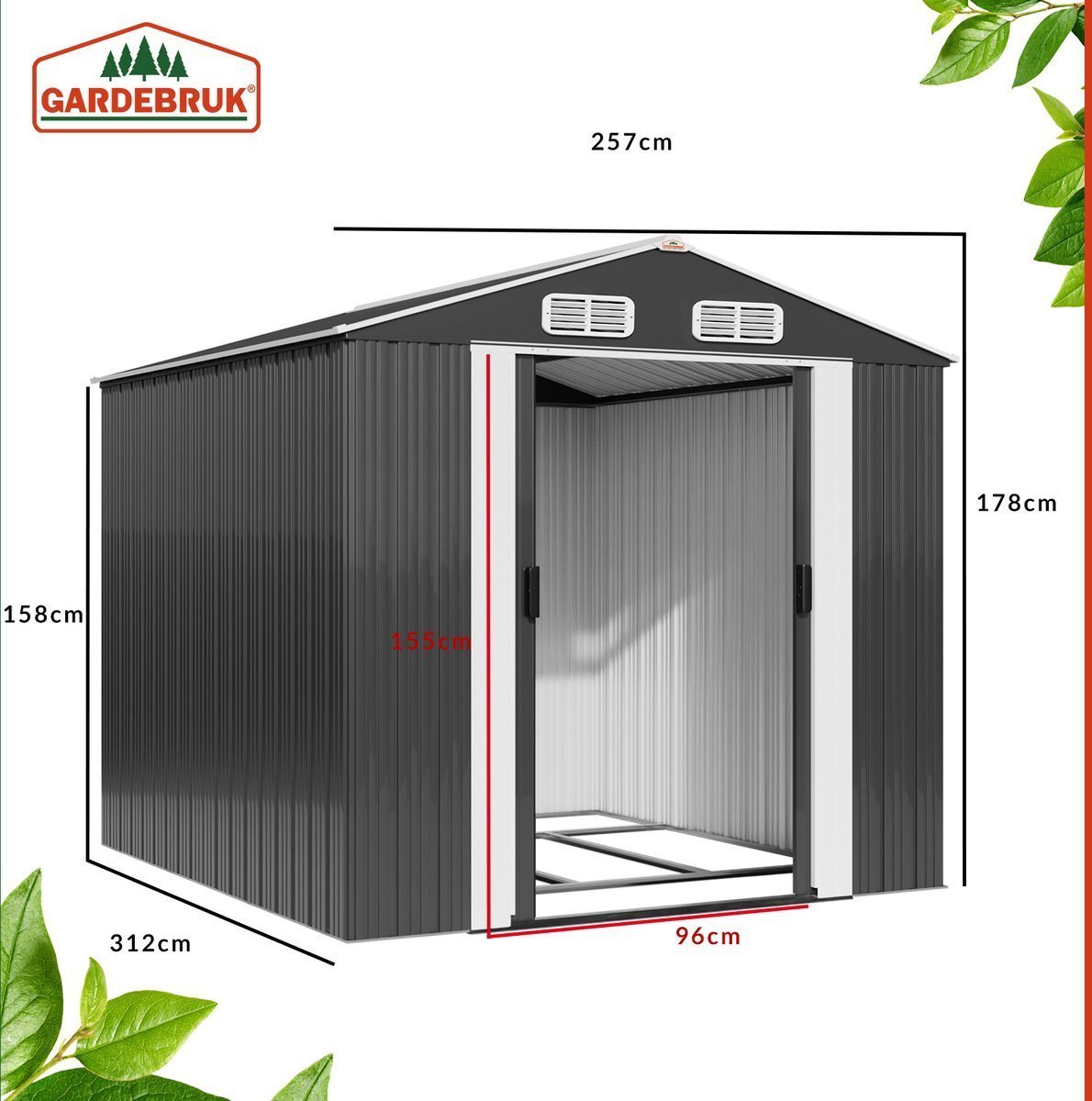 - Totale afmetingen met dak LxDxH: 257 cm x 312 cm x 177,5 cm