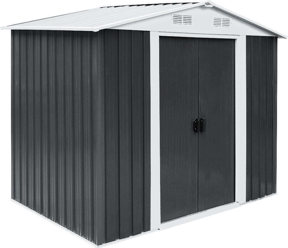 De tuinberging is uitgerust met een tweedelige schuifdeur, en 4 ventilatieopeningen bovenin (met 2 aan zowel de voor- als achterzijde) en wordt geleverd met vloerrails.