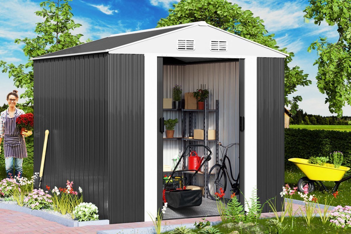 Dit tuinhuis met een inhoud van 14,65 m³ is ideaal voor het opbergen van tuingereedschap, tuinmeubels of fietsen. De gegalvaniseerde vloerrand biedt de mogelijkheid om een houten vloer te installeren (hout is niet meegeleverd).