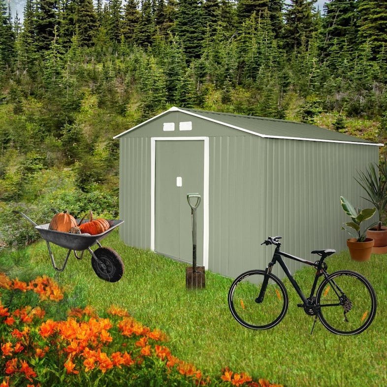De schuur is gemaakt van geverfd en gegalvaniseerd plaatstaal en heeft een tijdloos design. Het meegeleverde metalen funderingsframe biedt stabiliteit en een veilige stand – u heeft de mogelijkheid om hier een vloer te plaatsen (vloerplaten niet inbegrepen).