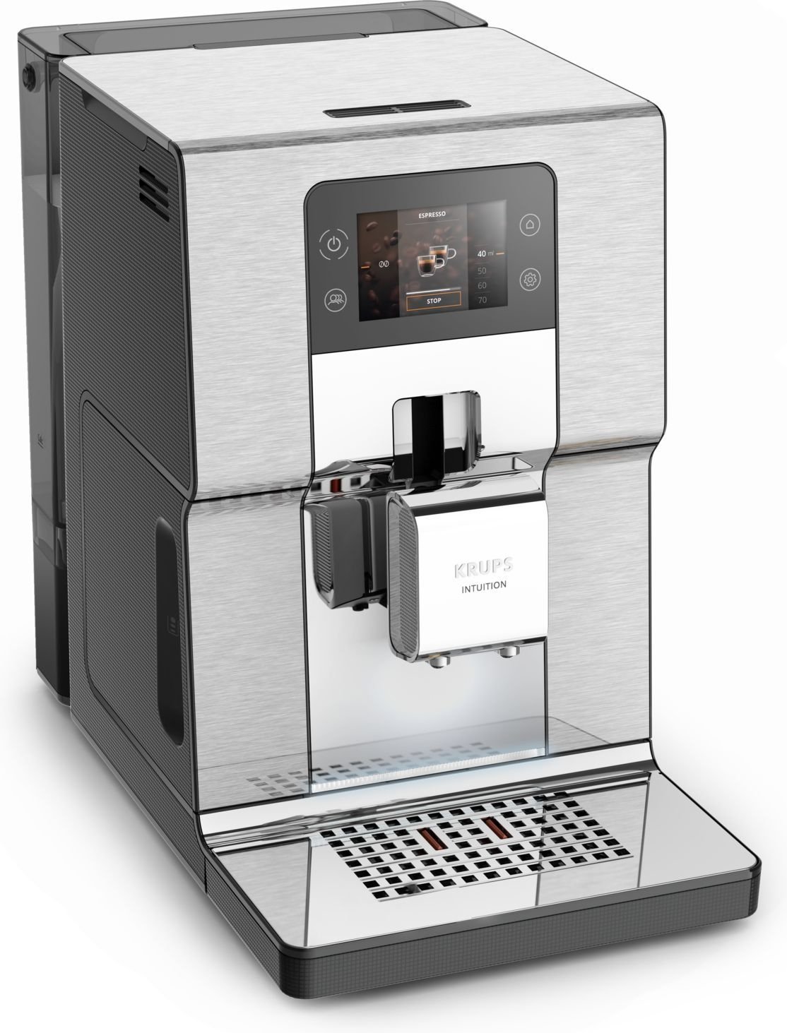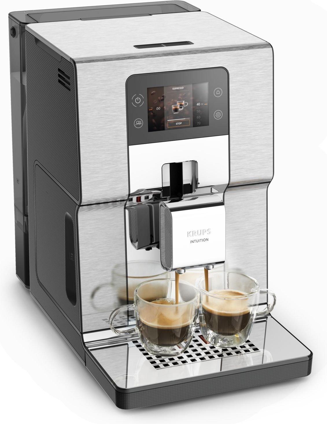 De Krups Intuition Experience+ EA877D is een high-end, volledig automatische espressomachine ontworpen voor maximale gebruiksvriendelijkheid en koffiegenot. Met zijn royale waterreservoir van 3 liter en een krachtig maalwerk maakt u moeiteloos meerdere koffiespecialiteiten achter elkaar. Het intuïtieve kleurentouchscreen met gepersonaliseerde profielen geeft u volledige controle over sterkte, temperatuur en hoeveelheid. Dankzij het geïntegreerde melksysteem maakt u romige cappuccino’s en latte macchiato’s met één druk op de knop. De machine heeft een modern design met ledverlichting en automatische reinigingsprogramma’s voor optimaal onderhoudsgemak.