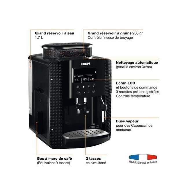 Expresso-Breker – Vermogen: 1450 W – Verwarmingssysteem: Thermoblock – Koffiekrachtinstelling – Onderhoudsprogramma’s – Afneembaar waterreservoir – Druk: 15 bar – Stoommondstuk – Inhoud watertank: 1,6 l – Capaciteit korrel reservoir: 500 g – fijnmaling instelling – Watertemperatuurinstelling – Automatische uitschakeling – Kleur: Zwart