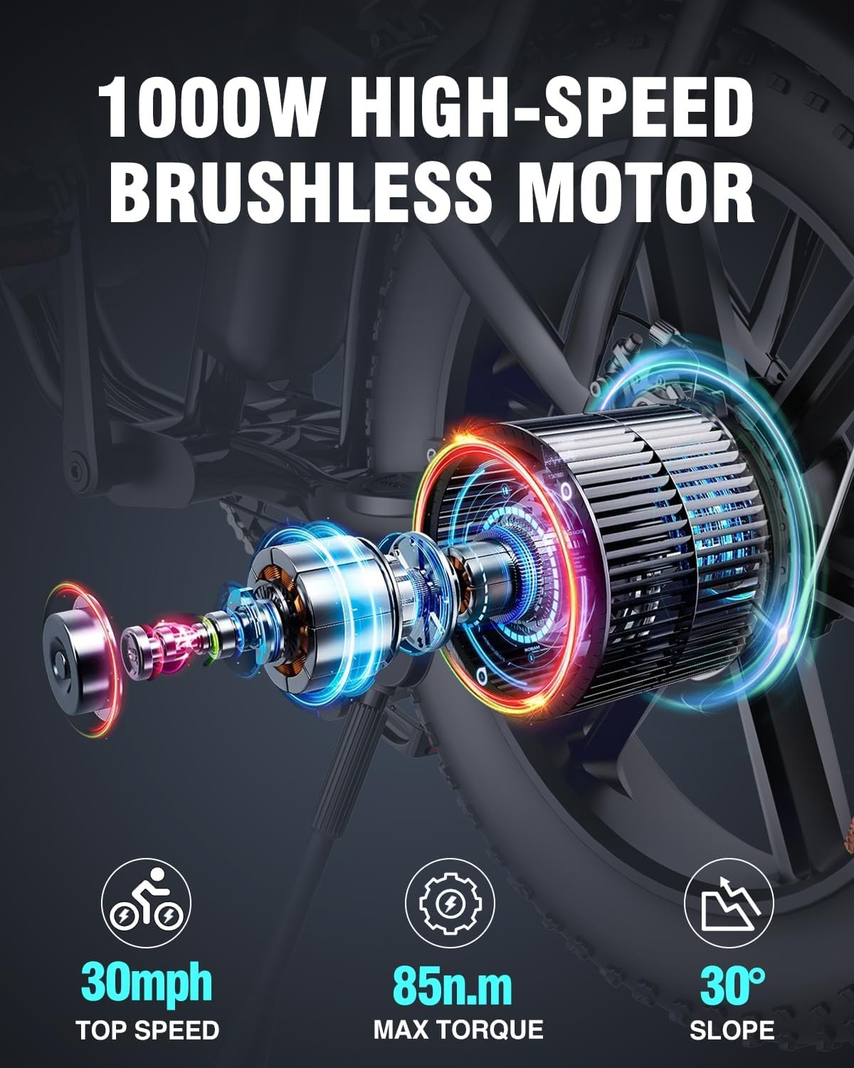 Equipped with massive 20″ x 4″ fat tires, the FM001 easily handles sand, snow, gravel, mud, and rough urban terrain. These oversized tires provide superior traction and shock absorption, ensuring a stable and comfortable ride on any surface. Coupled with a 30° climbing ability, this e-bike is ready to tackle steep hills and rugged trails without breaking a sweat.
