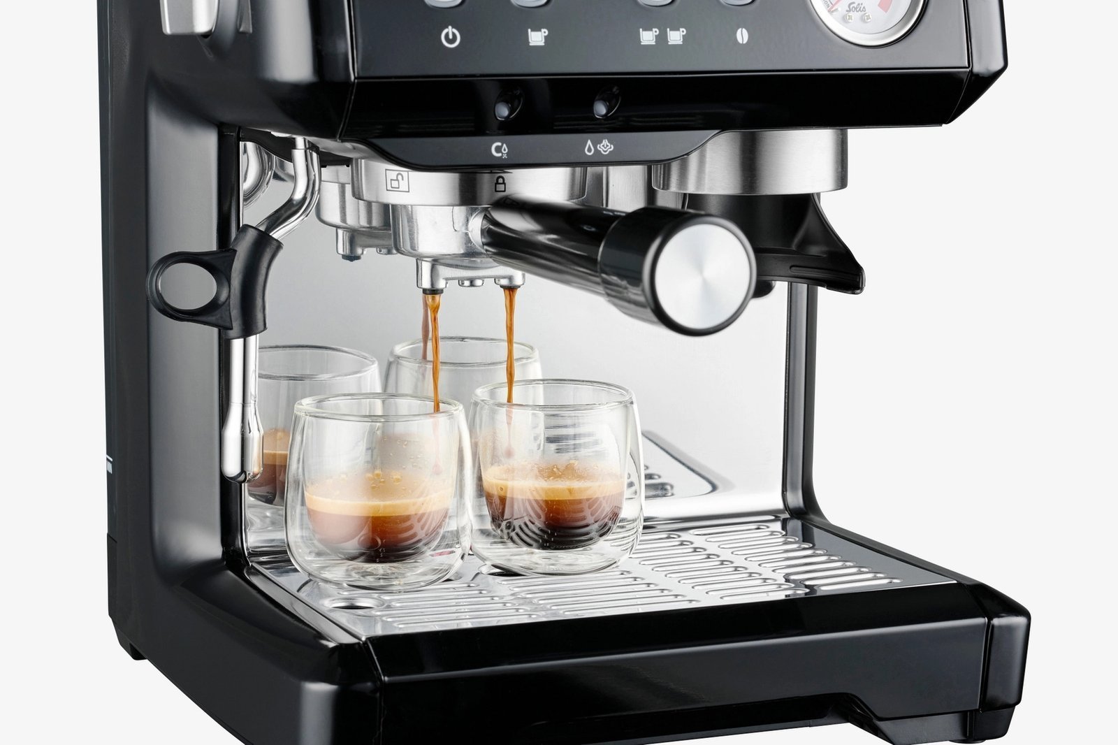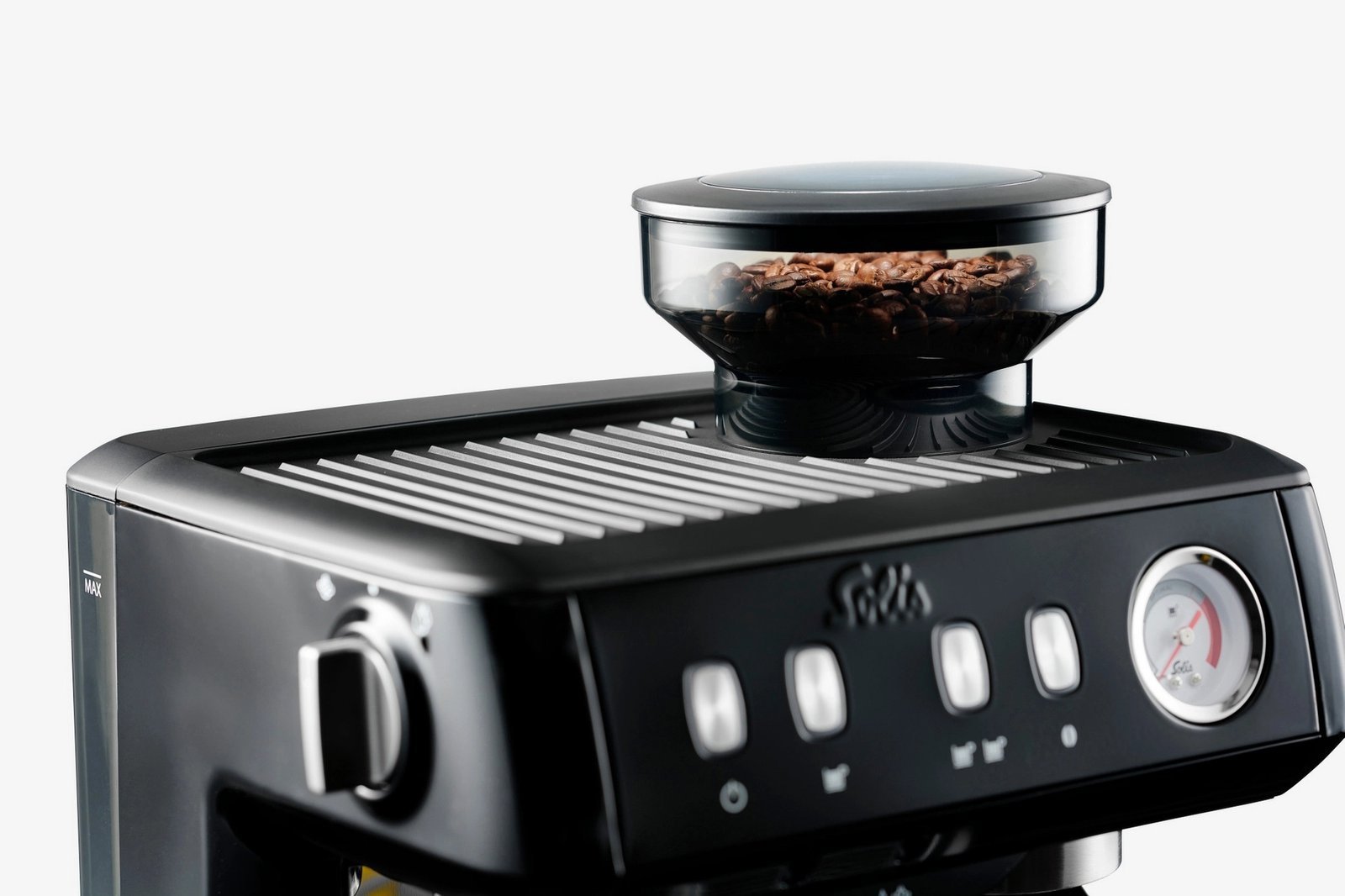 De Solis Grind & Infuse Compact is de espressomachine die over alles beschikt wat nodig is voor de perfecte kop koffie. De espresso-drukindicator zorgt dat de optimale druk voor een heerlijke espresso wordt ingesteld. De waarde is de druk waarmee het water door de gemalen koffie heen wordt geperst, een proces wat plaatsvindt in de filterdrager. Aan de dikke en gelijkmatige laag fijne, goudkleurige créma zie je direct dat de koffie perfect is bereid. De machine beschikt over een ruim bonenmaler met een capaciteit van 220 gram, dit zijn 30 kopjes koffie!