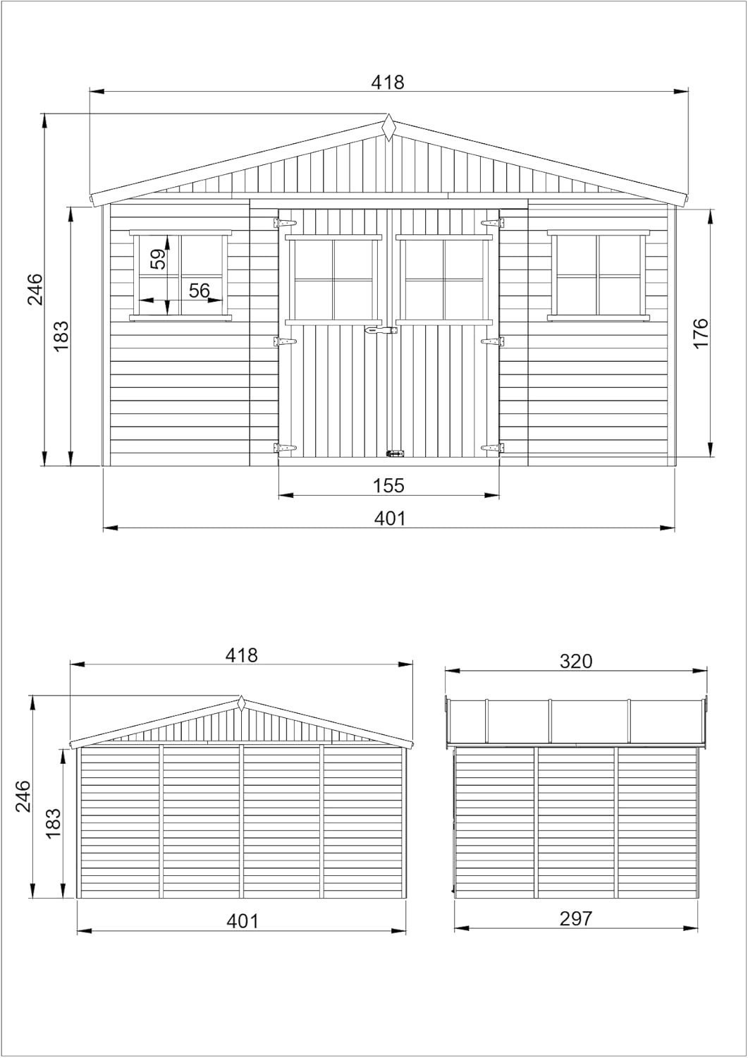 – Buitenafmetingen met dak: 418 x 320 cm
