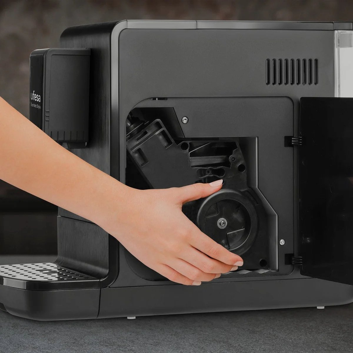 De Ufesa CMAB200.101 Sensazione is een volautomatische espressomachine die je in staat stelt om thuis te genieten van koffie van barista-kwaliteit. Met zijn compacte ontwerp van slechts 18,5 cm breed past hij perfect in elke keuken. Of je nu houdt van een sterke espresso of een mildere lungo, deze machine biedt de flexibiliteit om je favoriete koffie naar wens te bereiden.